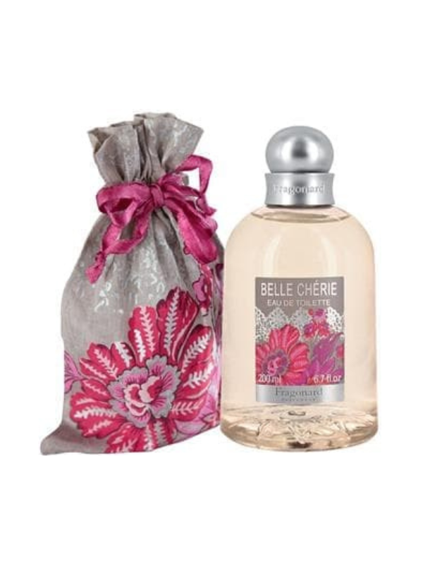 Belle Chérie dans son pochon fleuri : Un bouquet de fleurs, de fruits et de bois pour célébrer cette eau de toilette insouciante : Mandarine et carambole en tête, jasmin, héliotrope et muguet en coeur, santal, fève de tonka et vanille en fond. Le flacon 200ml est un vaporisateur rechargeable. Un petit geste pour la planète : pour les prochaines commandes pensez au bidon recharge 600ml pour le remplir.