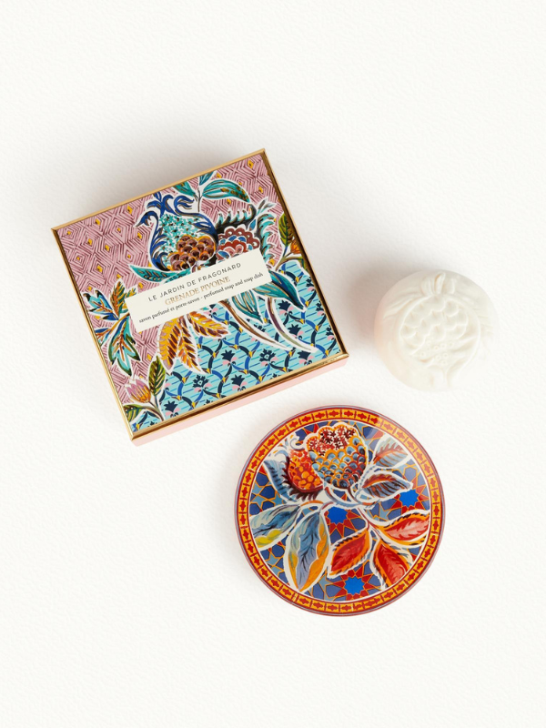 Le thé vert, même brûlant, désaltère. On se réfugie dans l’intimité d’un jardin andalou pour le déguster et profiter des jasmins en fleurs. Une sensation capiteuse toute en beauté et féminité. Savon 150 g – Porte-Savon 13 cm