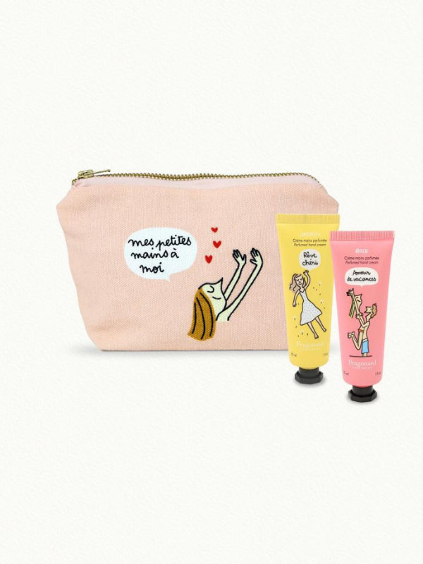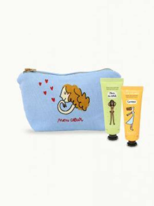 Envie de chouchouter vos mains avec style ? Cette trousse conçue dans un délicat coton bleu imprimé et dessinée par l’illustratrice française Soledad sera votre meilleure alliée. Une hydratation tout en douceur avec ses deux crèmes mains parfumées respectivement à la verveine et à la fleur d’oranger.